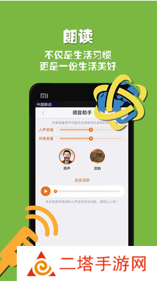 调音助手:担心自己的声音不好听?担心单调的诵读提现不出情感?没关系,调音功能让你的声音更加完美,配乐让你的诵读更具情感。