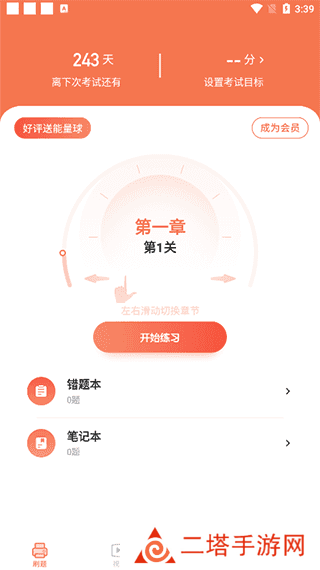 1、刷题界面,点击开始练习进入刷题闯关模式,还有错题本、笔记本功能,提供设置考试时间和考试目标