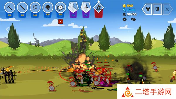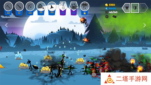 1. 兵种多样:游戏中拥有多种不同的火柴人士兵,包括剑士、弓箭手、矛士、法师和巨人等,每种兵种都有其独特的属性和优势,玩家可以自由搭配组合,打造最强阵容。