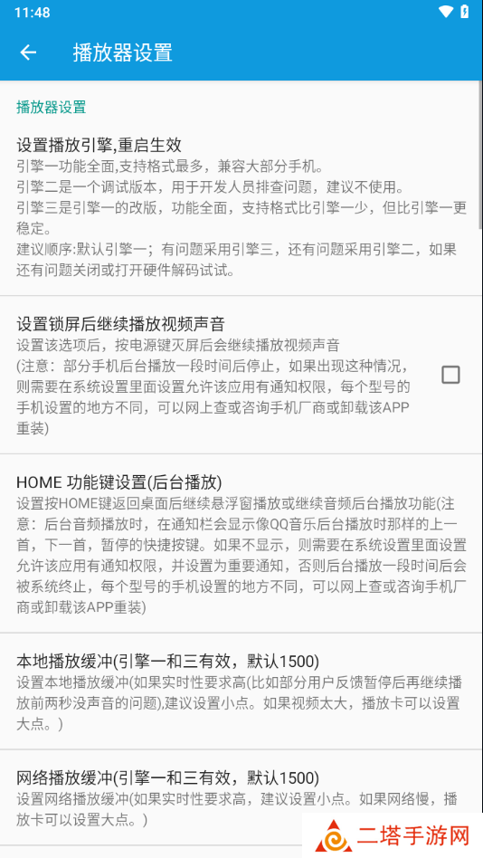 3.播网络视频太卡或暂停后再播放有几秒无声音:这是因为播放需要先解析一段视频才能播放,暂停后再播放几秒无声音可以在首页设置界面的本地播缓冲里面调节;网络播放卡可以在网络播放缓冲调节。