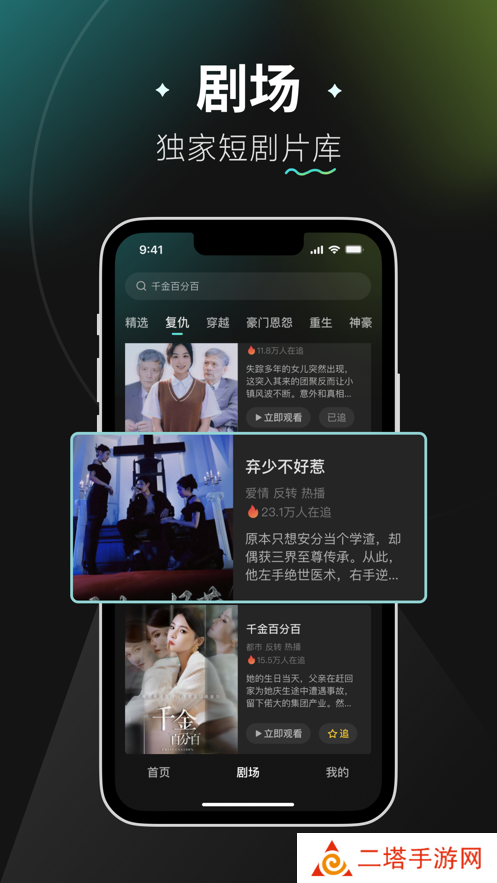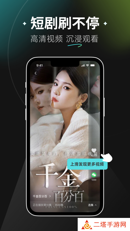 竖屏短剧体验,沉浸式看剧享受,上下滑动交互、快速选集播放,满足一切你想要的看剧体验。