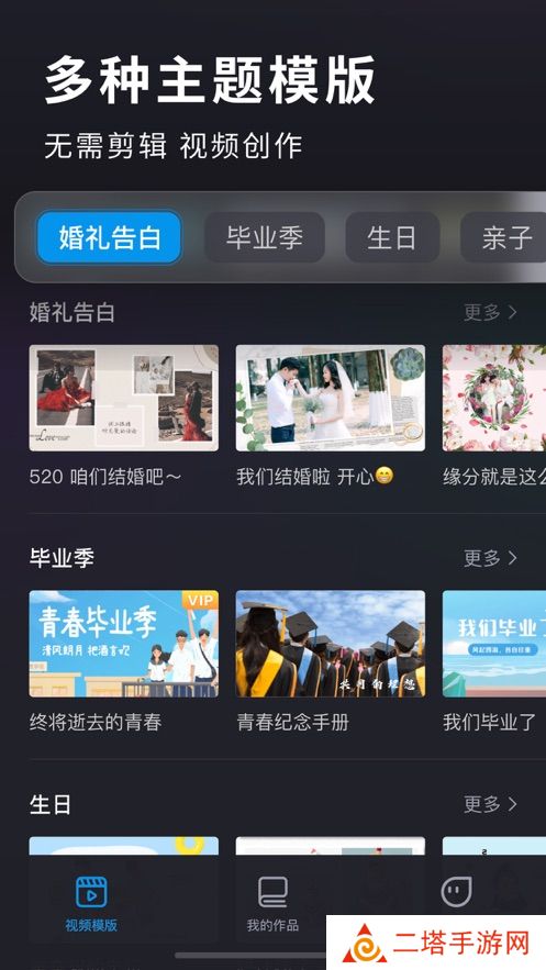 它内部集成了海量视频主题模板,包括婚礼爱情、企业宣传、生活相册、节日祝福、VLOG、亲子时光、校园毕业季、音乐相册等主题,涵盖工作与生活的各个场景。