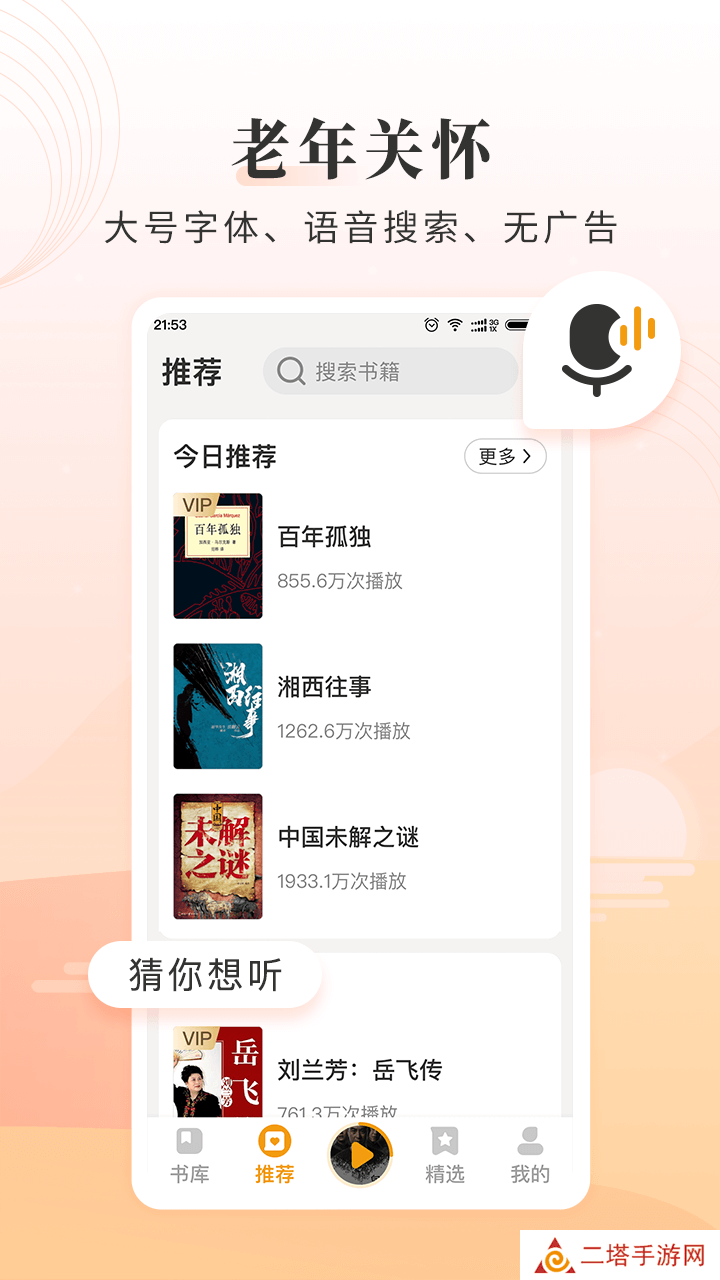 懒人听书大字版全新发布,语音搜索、一键收听、大字体、无障碍适配、无广告...,中老年听友们面临的听书困难在这里都不是问题,快给爸妈安装上吧。