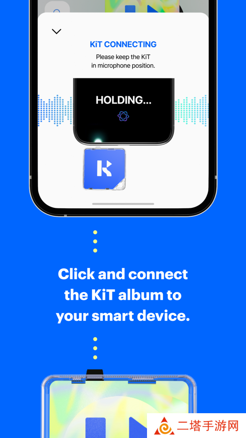 - 打开KiT Player,将KiT专辑的配件-KiT switch拿到移动设备的下端,将它轻轻按下,听到‘咔哒’的声音。