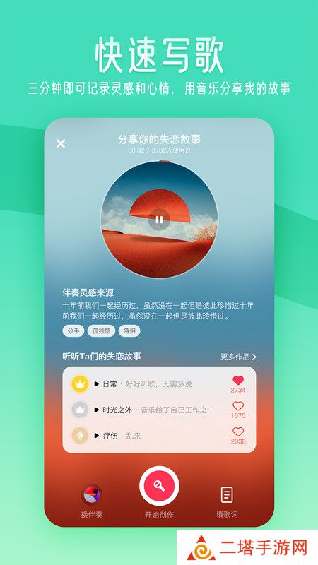 一个可以让你快速创作歌曲并分享出来的互动交友社区,它可以让你用歌曲表达任何一种场景或心情。