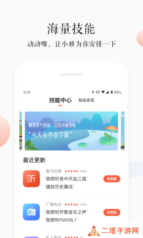 喜马拉雅出品的小雅AI音箱、小雅Nano音箱,是集智能语音交互、全量喜马拉雅内容和天气、闹钟、情感聊天等海量技能于一体的无屏智能音箱。