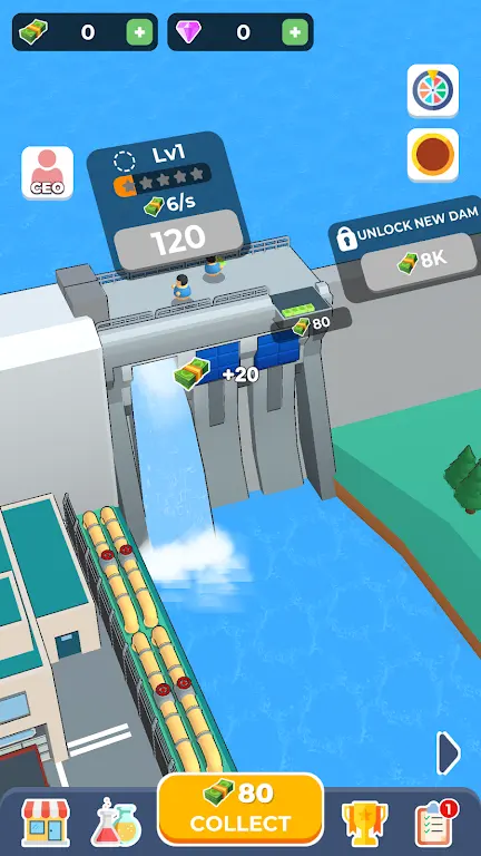 1. 初始阶段:玩家从一片宁静湖泊上的小巧水坝开始,通过完成初始任务获得金币和资源,逐步升级大坝的基础设施。