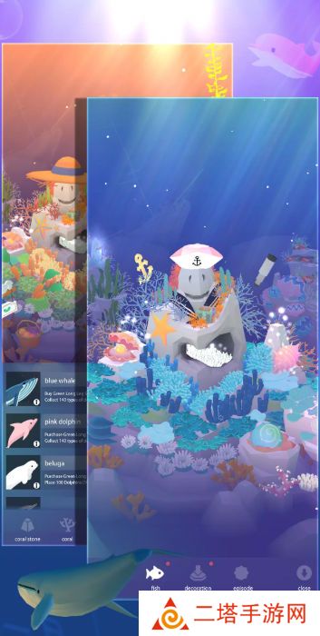 1. 收集与培育:游戏中设有多种海洋生物等待玩家发现与收集,包括色彩斑斓的鱼类、奇特的珊瑚、神秘的深海生物等。玩家需通过完成任务、探索深海或与其他玩家交换等方式获取新物种,并在水族馆内精心培育它们。