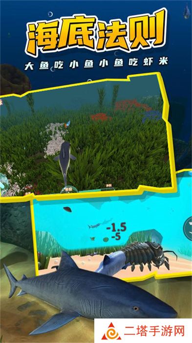2. 吞噬成长:在深海中,玩家需要不断寻找并吞噬各种海洋生物,以此来获取能量和经验值,使巨鲨逐渐成长并解锁新的形态和能力。