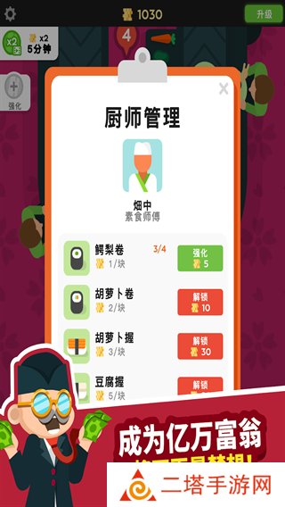 1. 放置经营:游戏采用放置玩法,玩家只需设定好厨师和服务员的工作内容,他们就会自动进行寿司制作和顾客服务。玩家可以适时调整策略,优化经营流程。