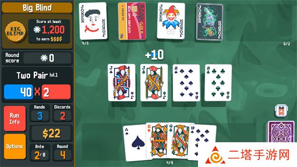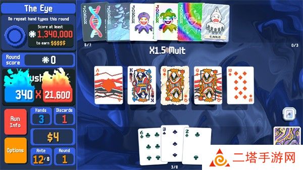 4. 挑战关卡:通过出牌和弃牌来达成关卡设定的分数目标,同时利用小丑卡牌和其他特殊卡牌改变战局,赢得胜利。