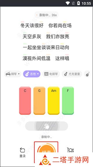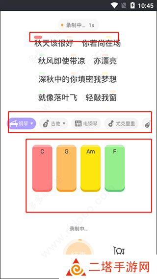 3、同时需要选择你弹奏的乐器,然后就在会歌词上方显示不同的颜色,而不同的颜色对应着不同的按键;