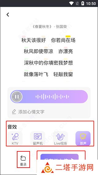 6、然后就可以在线试听刚才弹唱的录音,并可自定义设置音效,满意即可点击保存并上传,不满意即可点击重录即可。