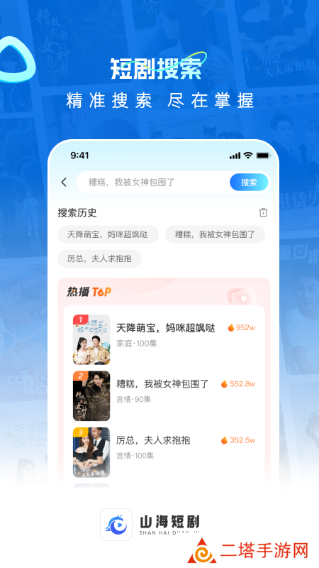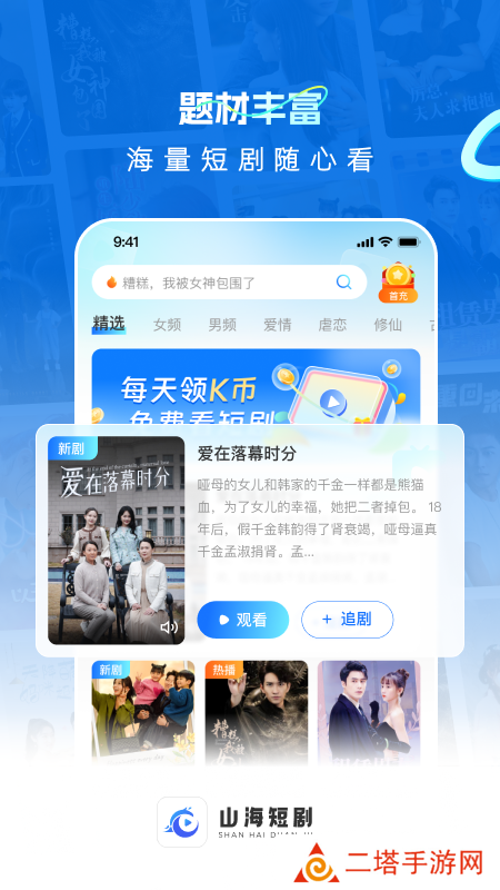 山海短剧app最新版下载是广西山海星辰文化传媒有限公司倾情推出的一款短剧平台,平台拥有海量短剧资源,播放高清流畅,更新速度快,还拥有丰富的活动福利,可以给予用户超棒的短剧观看体验,喜欢看短剧的朋友可千万不要错过啦。