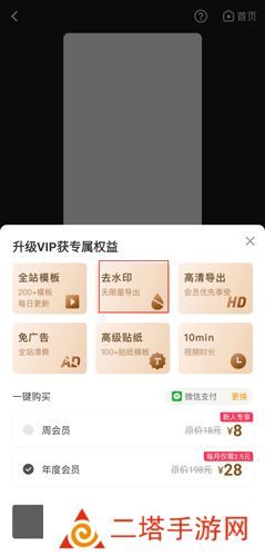 3、其实想要去除水印,是要成为vip会员的,想要成为会员,是要交钱,周会员8元,年度会员28元。