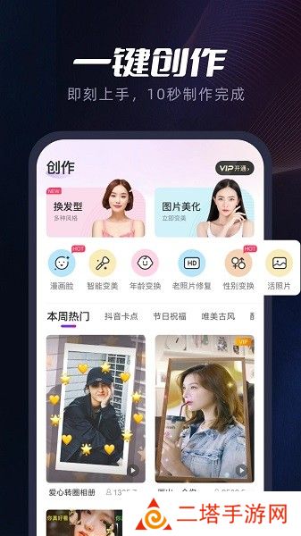 指尖特效软件是一极具个性化的视频简介软件,简洁无广告的高端设计,超实用的声音卡点神器,自带魔法相机,拍照可以一键美颜,各种图片都能美化,还能用来修补证件照,多种证件照款式设计,还有性别转换和动漫脸多种功能,赶紧下载试试吧。