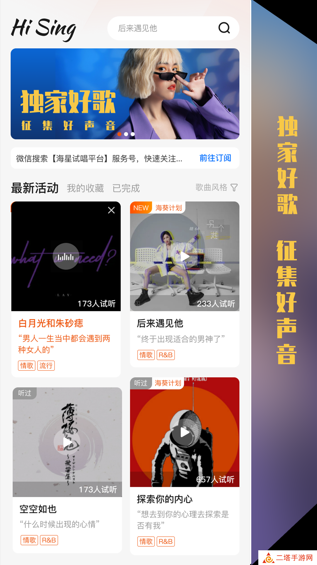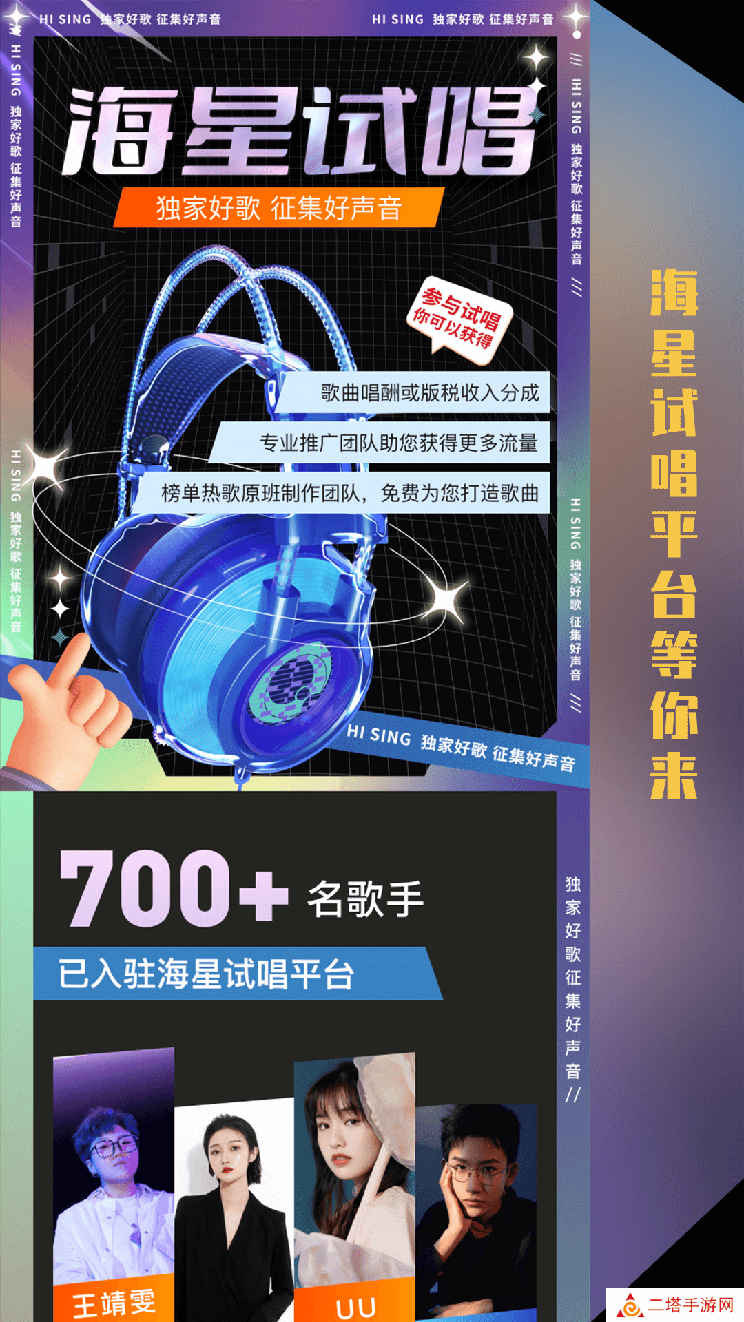 海星试唱app是一款非常好用且专业的音乐试唱软件,软件内置拥有超多丰富的音乐资源,汇集了超多的音乐人在软件内发布自己的原创作品,而且软件还支持片段试唱、全曲试唱、线下演唱三种试唱方式,让自己可以找到最适合自己的模式,是一款帮助用户找到音乐合作的一个平台。