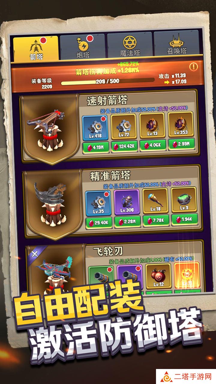 2. 塔防战斗:通过建造和升级多种功能的防御塔,搭配装备激活不同效果,合理布置防线,抵御敌人的进攻。