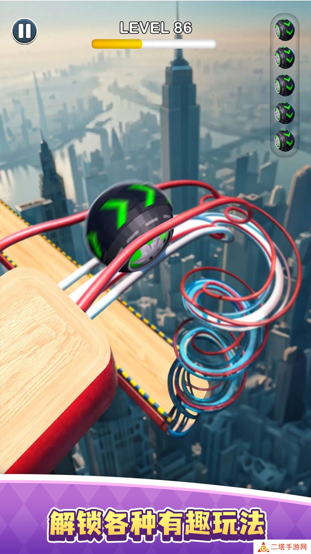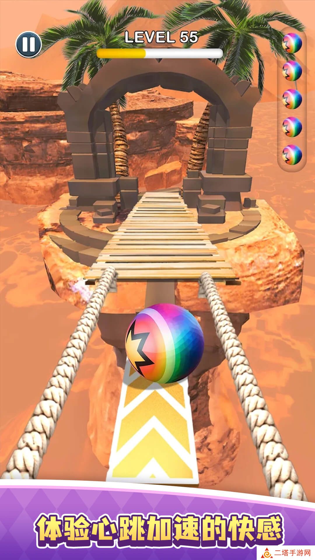 3. 挑战关卡:在关卡中,玩家需要控制球球不断前进,避开各种障碍物,如尖刺、陷阱、移动平台等。同时,还可以收集金币、加速带等道具来增强自己的实力。