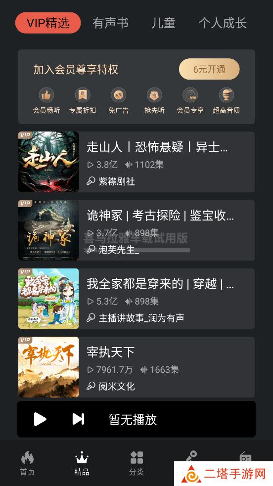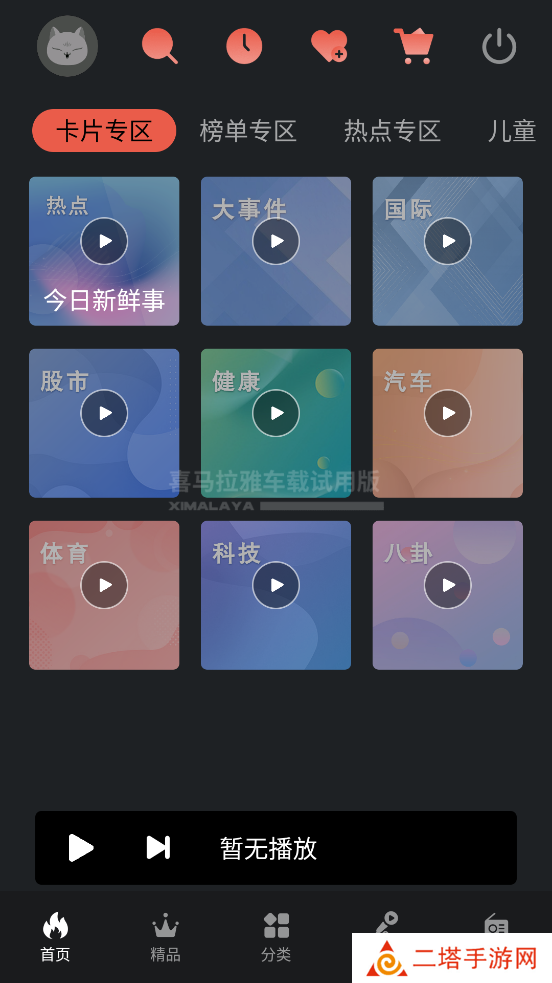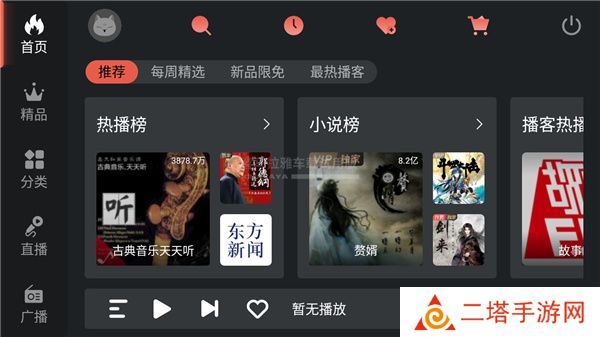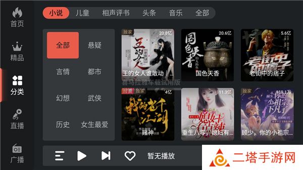 3、分类选项中,提供了小说、评书、头条、音乐、儿童等多种类别的内容;
