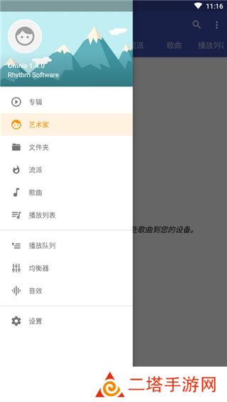 2、点击左上角的"三"标识显示出侧边弹框,主要通过专辑,艺术家等进行管理;