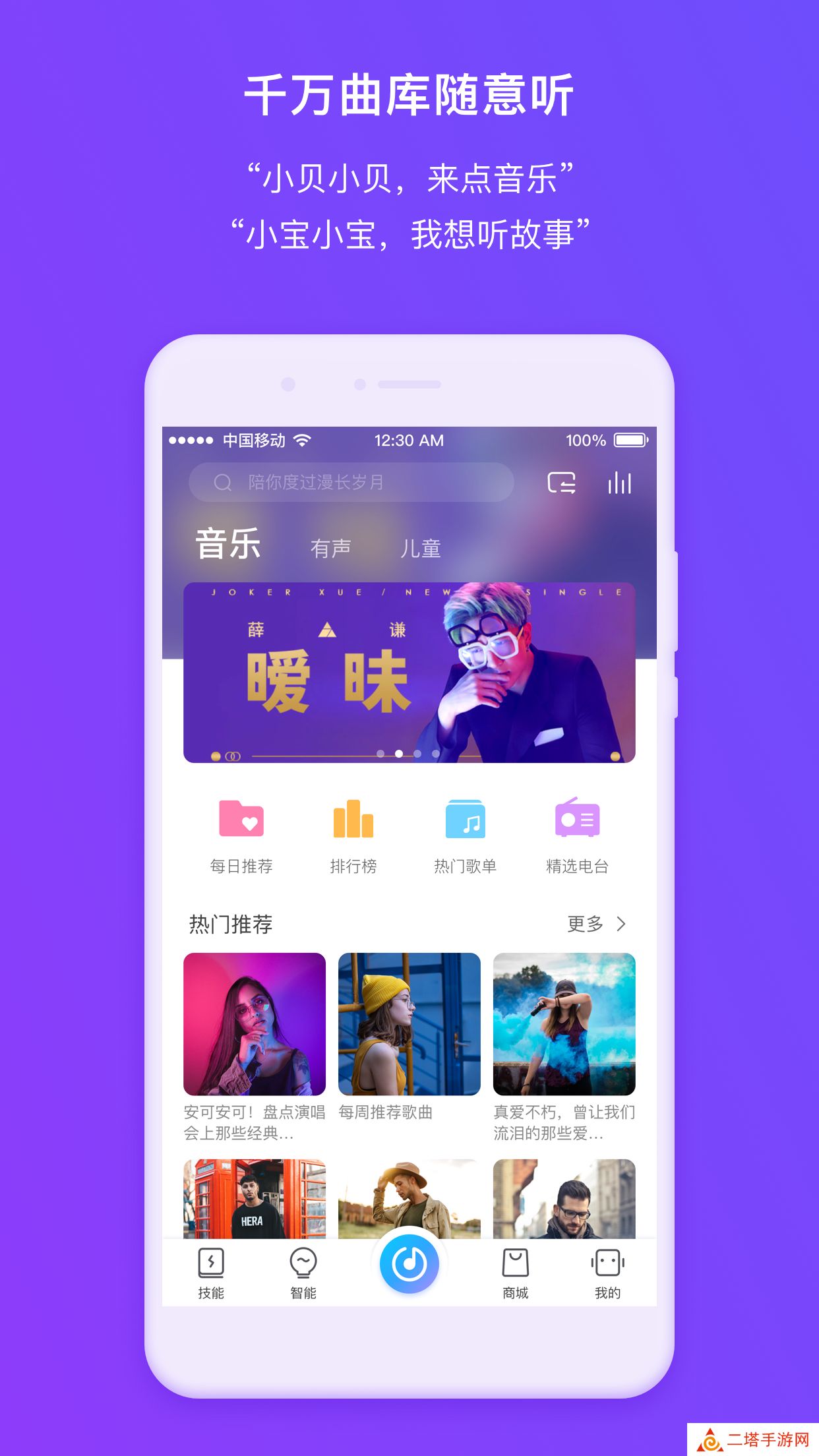 6、APP界面简洁,分为四大板块:技能、智能、商城、我的,技能板块主要是各种语音指令的介绍,分为娱乐、儿童、生活和工具,基本上涵盖了各种语音指令,初次上手AI音箱的用户可以大致看一下,会更好地用语音来控制AI音箱。智能版块则是用来调节智能家居的场景应用,内置了一些基本智能场景,例如“我上班去了”,AI音箱会自动打开联网的智能摄像头,关闭智能灯,启动智能扫地机等。
