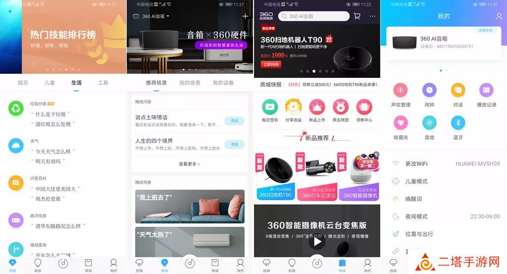 除此之外还可以自定义智能场景,添加一个说法,让音箱如何回应。商城板块则是360商城,除了360自有品牌产品,还有第三方品牌入驻。我的板块里则可对360AI音箱MAX详细设置,声纹管理、闹钟、对话、播放记录、收藏夹、音效、蓝牙,更改WiFi,进入儿童模式,唤醒词,夜间模式等,都在这个板块。