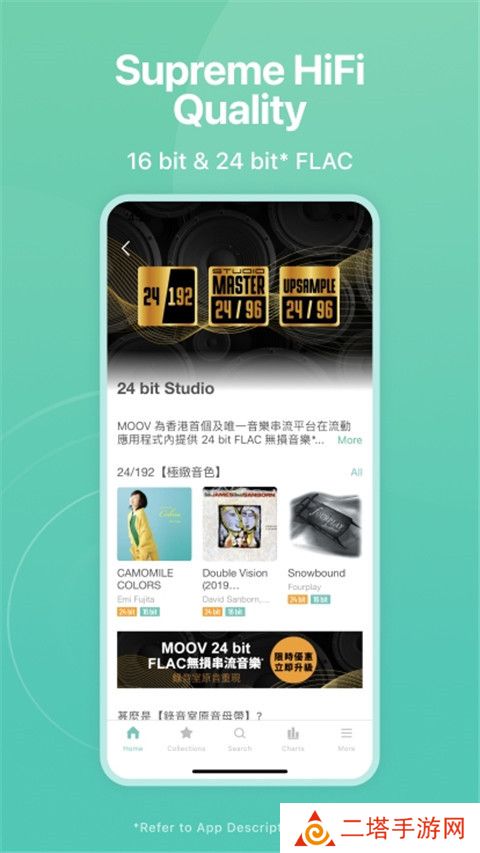 3、提供 24 bit 无损串流音乐,提供录音室原音母带版本及升频版本,让乐迷尽享达录音室原声级数的听觉体验