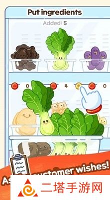 2. 操作方式:点击屏幕选择食材,拖动食材至锅中进行烹饪,完成订单后交给顾客即可获得金币。