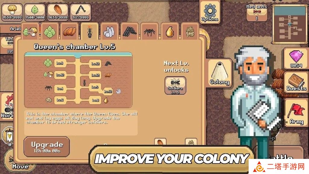 1. 建设与管理:玩家需要设计建造自己的蚁穴,包括食物储存区、孵化室、兵蚁训练营等多种功能的房间。随着蚁群的壮大,玩家需不断扩展巢穴,以适应更多蚂蚁的居住和食物储备需求。