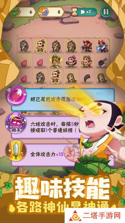 3. 海量英雄,自由搭配:玩家可以召唤不同的葫芦娃和其他神话英雄,根据敌人的属性和战斗需求进行合理的搭配,打造独特的战斗组合。