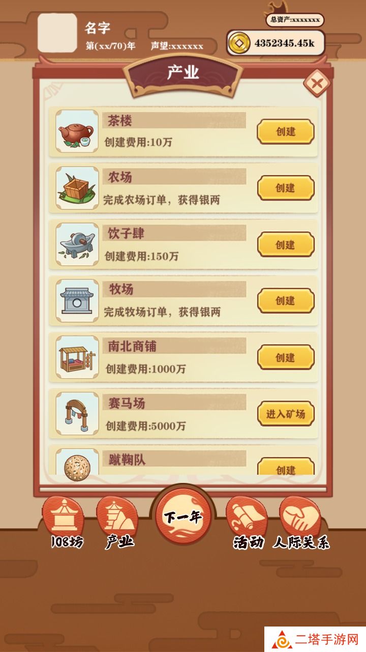 2. 游戏目标:通过经营不同类型的产业,如茶楼、农场、牧场、南北商铺等,扩大商业规模,提升名声和财富。