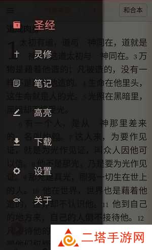 点击首页左上角,用户可以看到圣经、灵修、做笔记和设置等选项。
