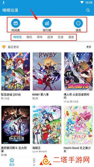 嘀嘀动漫怎么用1、进入首页了,首页为大家展示了时间表、排行榜、消息等内容,在下面还为大家提供了很多中资源动漫,比如嘀哩哩、樱花等等,大家可以选择切换观看;