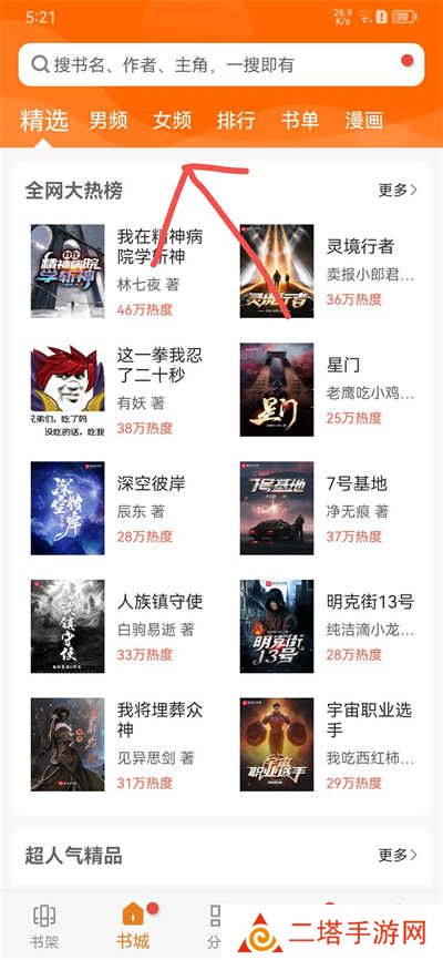 2、在首页中,我们可以看到精选、男频、女频、排行、书单、漫画等。