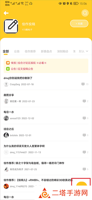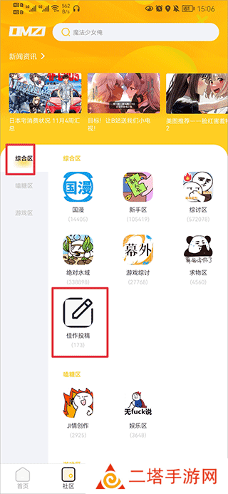 1、打开动漫之家社区app,在社区界面中的综合区内点击佳作投稿