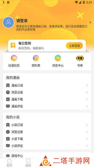 4、点击最后一个模块“我的”,在此可以进行签到和注册登录,以及加入动漫社区。