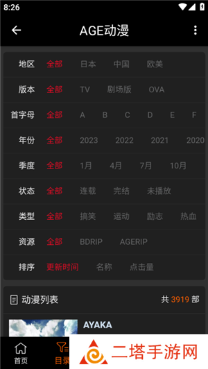 2、目录页面:会对动漫进行地区、版本、首字母、年份、季度等排列,方便用户寻找;