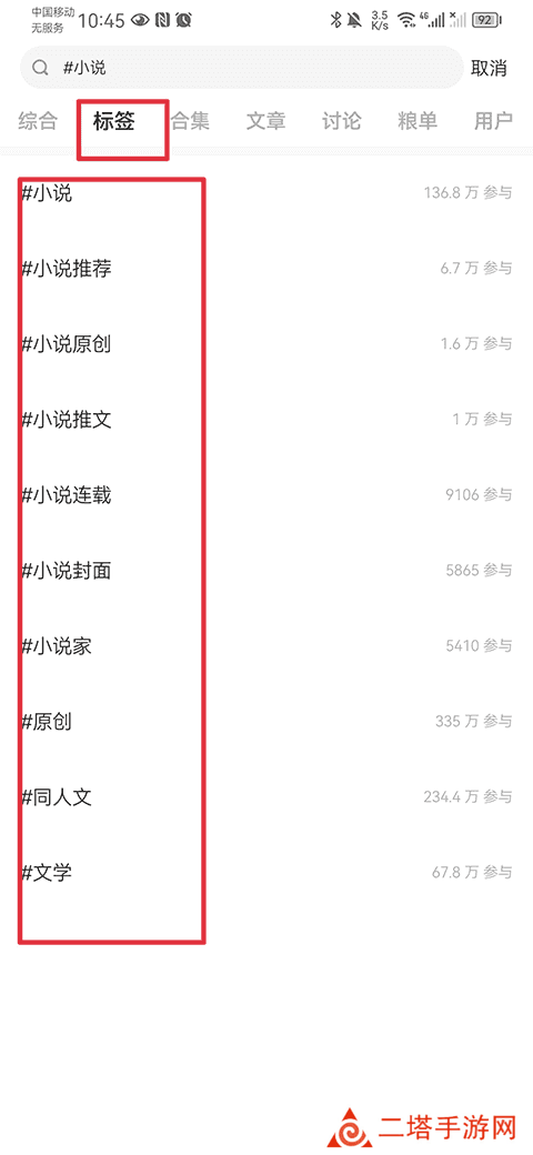 2、然后在标签页面中选择你感兴趣的小说标签,例如文学