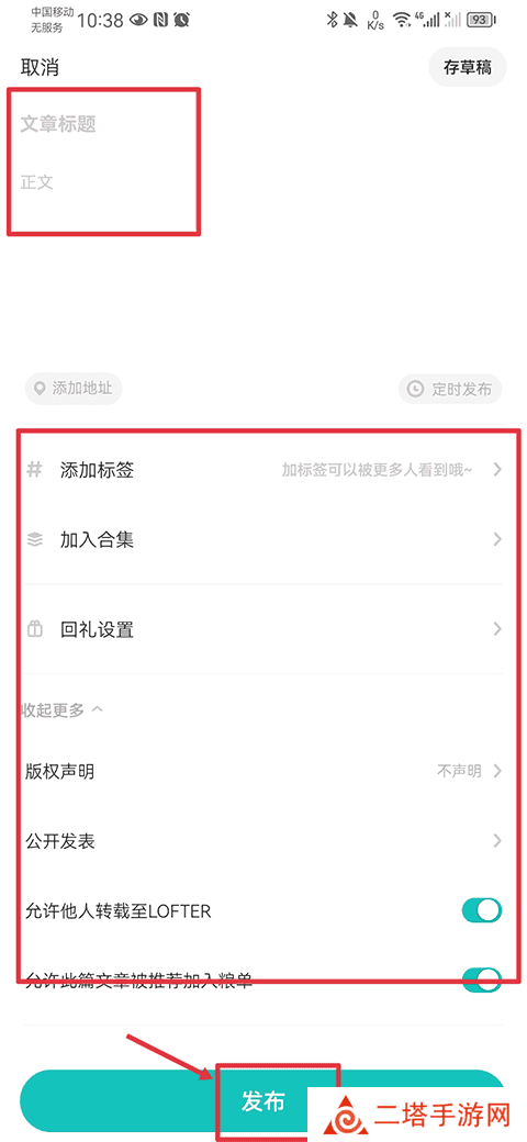 3、将文章标题、正文编写完成后,再根据自己的需求添加标签、设置回礼、版权、转载等,最后点击发布即可