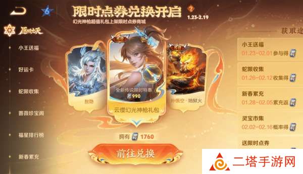 此外,2月2日还会开启灵宝市集和新的皮肤活动,这里要说到限时点券,对于限时点券的用处,无论是玩云缨还是不玩云缨的小伙伴,都建议先兑换幻光神枪,为什么这么说呢?
